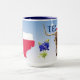 Design de caneca única com flores de Bluebonnet do Texas e um Texas Longhorn em azul claro. Também apresenta as cores do contorno de estado e do sinalizador. Negros e patrióticos são as cores da bandeira. A flor de Bluebonnet é a flor do estado do Texas. Em março e abril, estas lindas flores florescem em campos e meios de comunicação nas autoestradas.