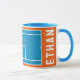 Uma caneca de presente de jogador de tênis criativo com bolas de tênis no campo de tênis azul e laranja. Para personalizar editar texto para adicionar seu nome.