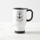 Uma caneca de viagem personalizada com a classificação Capitão ou outro título, o nome do barco, o nome da família ou outro texto desejado. Apresentando uma âncora náutica, folhas de ouro e emblema de estrela desenhadas por medida, em branco. Faz um presente excelente para qualquer ocasião.