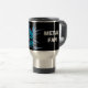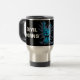 Esta é uma caneca inoxidável de aço do viagem/viagem ao trabalho que caracterize os chifres do diabo/metal/rocha no azul e no texto que diz do "chifres diabo" e do "fã metal".