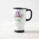 Caneca de viagem bonito, personalizada que caracteriza uma coruja roxa pequena dos desenhos animados que senta-se em um ramo com folhas do verde e as flores roxas. Design do divertimento para meninas e mulheres. Nome customizável ou o outro texto curto de sua escolha.