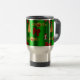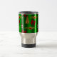 Um design de Natal bonito com um padrão de decorações de Natal incluindo árvores de Natal douradas, groselhas de ouro e morangos vermelhos, arcos de seda vermelha e um adorável boneco de veludo vermelho e colete, tudo em um fundo verde para adicionar algumas alegrias de Natal à sua casa durante as férias.