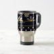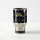Uma caneca de viagem com um teste padrão de flor retro feminino da modificação na parte superior com as margaridas brancas com centros amarelos contra um fundo dos azuis marinhos, e um teste padrão de bolinhas azul e branco na moda na parte inferior. Personalize adicionando seu nome. Aperfeiçoe o presente para uma menina feminino à moda.