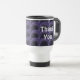 Expresse sua apreciação com uma caneca de viagem matinal com um padrão moderno de abstrato. Este obrigado moderno que você faz é adorado com camadas de círculos sobrepostos com um padrão roxo e preto girado. "Obrigado" aparece em ambos os lados da caneca de viagem em caracteres brancos e pode ser facilmente personalizado se desejar.