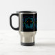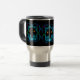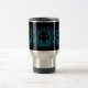 Esta caneca de viajantes apresenta três rostos assustadores com olhos brilhantes de ouro cercados por um padrão geométrico quadrado de ornamentado em tons de azul com acentos de verde e rosa. Eles são colocados sobre um fundo negro para um efeito dramático.