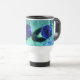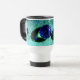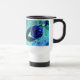 Gotas de água em uma folha depois da chuva se alienaram em uma cor azul. Uma fotografia macronatural de gotas de chuva por Katho Menden. Esta caneca de viagem é uma ideia de presente para amantes da natureza. http://www.zazzle.com/kathom_photo