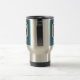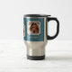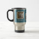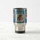 Caneca de viagem com lugar para três fotos com nomes. Cor azul colonial bonito e porta-fotos antiquados como quadros, um nome de solteiro pode ser adicionado acima e abaixo de cada imagem. Use para fotos de crianças, animais de estimação, férias ou qualquer coisa. A caneca vem em branco ou prata.