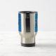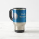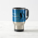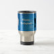 Distinctive travel mug with non-spillable lid and sip opening. Volleyball sports theme. Editable design. The design features a large volleyball on one "side" and the silhouette of two players on the other. A vivid, mottled blue background. Personalize it with a name. When you select “Personalize this design” you will be offered options to easily change the text (wording, plus type font, color, size, position) and to possibly edit the design elements with changes you may want to make. Other mug styles available -- check out Options.