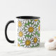 Um teste padrão bonito do estilo do hippie da margarida branca e amarela floresce com caras em um fundo verde.