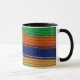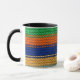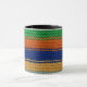 Listras de malha multicolores em verde, vermelho, laranja, azul claro, amarelo e azul escuro, textura de lã. Fotografia.