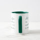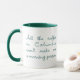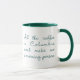 "Todo o café na Colúmbia não me fará uma pessoa matinal" Escrito em uma fonte verde em estilo escrevendo em ambos os lados da caneca.