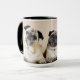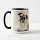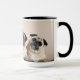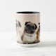 Três Pugs deitados lado a lado e todos inclinando suas cabeças da mesma maneira.