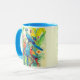 Mug in vividly colored tropical birds surrounded by lush green foliage and vibrant flowers. The birds display brilliant shades of red, blue, yellow, and green. The scene depicts exotic beauty and rich botanical detail.