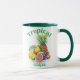 Mug in a collage of colorful tropical fruits including pineapple, papaya, mango, gogi berries, kiwi, and lime, with a tropical theme of rich textures and lush foliage on white