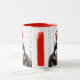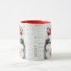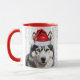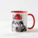 A caneca tem um design de um lindo Husky Siberiano vestindo um chapéu de Papai Noel. O fundo da caneca é coberto por um padrão repetitivo das palavras "woof". A imagem é brilhante e alegre, e seria perfeita para um presente temático de Natal.
