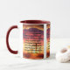 Esta caneca apresenta uma oração diária agradecida sobre uma imagem bíblica mostrando 3 cruzes com o fundo do sol com um tema colorido. A jante e o manípulo são vidrados em cores compatíveis, disponíveis em micro-ondas e máquinas de lavar louça de tamanho 11 onças ou 15 onças, construindo cerâmica segura.
