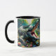 Un énorme crocodile géant allongé au bord d’une rivière calme, entouré de fleurs tropicales et de papillons colorés, ouvre grand sa gueule au milieu d’une forêt tropicale, baignée de lumière et de nature luxuriante et sauvage.