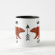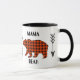 Se a sua mãe é uma "Ursa de Mama" orgulhosa, esta é uma caneca apropriada para qualquer ocasião, mas especialmente para o Dia de as mães ou o seu aniversário. Uma silhueta de xadrez de búfalo vermelha e preta anda entre duas setas pretas opostas. O texto negro abaixo e acima da imagem do urso diz "Urso da Mama". A imagem e o texto são repetidos em dois lados da caneca.