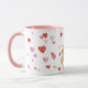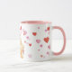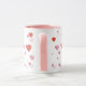 Uma linda caneca de café com corações cor-de-rosa e vermelhos e um artista giro Urso de pelúcia, segurando lata e pincel de tinta.