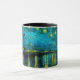 Café Mug com o óleo de Vincent van Gogh pintando Starry Night sobre o Ródano (1888). As estrelas amarelas brilhantes decoram o céu azul noturno como um casal rolando ao longo de um riverbank em Arles. Um presente perfeito para fãs de Impressionismo Poste e arte holandesa.