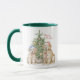 Caneca de Natal com a ilustração aquosa de dois filhotes de golpistas vestidos para os feriados em chapéus de natal sentados em frente a árvores de Natal enfeitadas com luzes e ornamentos. Uma saudação Feliz de Natal no canto superior direito, em uma cor que combina ilustrações. Estilos adicionais e cores da jante e da alça disponíveis.