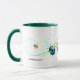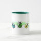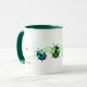 Uma caneca bonito com joaninhas coloridos contra swirly uma bandeira.