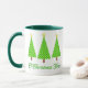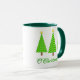 Mug em uma tomada moderna sobre um clássico motivo de árvore de Natal - três árvores em bolinhas verdes limões sobre um fundo verde mais profundo, com o texto "O Árvore de Natal"