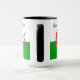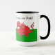 Uma caneca branca com uma borda e um punho preto e um dragão e um "Wales vermelhos bonitos de Galês para sempre" em Galês, na rotulação preta, de que você pode mudar ou suprimir se você deseja; de uma ilustração pintado à mão por Judy Adamson.