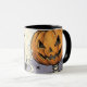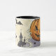 Get ready for fright night with this vintage-style Halloween mug! This unique combo design perfectly captures the classic spooky season vibe. One side features a chilling Jack-O-Lantern with a skeleton emerging, complete with cobwebs and spiders. The other side showcases a wise owl wearing a witch hat, with a haunted house and bats flying against a checkerboard background. This ceramic drinkware is an ideal product for enjoying coffee, tea, or cider on those chilly October nights, making it the perfect Halloween gift for any fan of classic spooky decor.