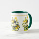 Lindos violetas botânicas roxas, amarelas e azuis e flores pansas florescem através desta elegante caneca de café. Um ornamentado de borda de folhas e flores atravessa o topo em cores de ouro.