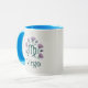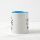 This mug features a stylized zodiac design of the Virgo symbol and purple aster flowers. The Virgo symbol is in metallic teal positioned in the center of the composition. Eight purple aster flowers with orange centers are arranged in a circular pattern around the symbol, with some flowers fully bloomed and others in bud form. The flowers have dark green leaves and stems that extend outward. Below the symbol is the word Virgo in a decorative teal font with a metallic sheen. The flowers are a watercolor art style with lavender gradients. The mug is a turquoise and white combo mug. The mug has a turquoise glaze interior and turquoise handle. The mug is a ounce mug.