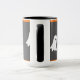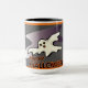 Esta design apresenta um fantasma voando à noite com o Feliz Dia das Bruxas impresso em preto e vermelho. Um fantasma flutuante, flutuando pelo ar com olhos tão pretos quanto carvão. Uma borda laranja junto com uma opaca negra. Estas canecas estão disponíveis em estilos e tamanhos variados. Personalize como quiser.