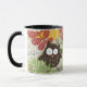 A playful illustration of a cute brown owl surrounded by colorful abstract flowers and leaves in a vibrant forest scene.