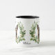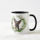 Esta caneca apresenta o retrato aquoso de um artista de um lindo cão malinois belga dentro de uma margarida branca e coroa verde. A imagem é impressa duas vezes na caneca, com seu nome ou monograma no fundo entre as imagens.