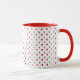11oz white mug featuring a playful pattern of small hearts in dark red, cool red, dark gray, and light gray, with a red handle and red interior. Perfect for cozy coffee moments or as a stylish gift.
