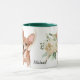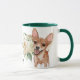 Por trás deste retrato adorável de um feliz cão Chihuahua branco e marrom nesta caneca está um bonito buquê branco de rosa. A imagem do buquê e do cão tem uma espiral de espiral falsa de fiação falsa. A imagem é impressa em dois lados, com seu texto personalizado em preto no centro, na parte inferior, entre as imagens. *Observe que a imagem é impressa e não contém brilho real.