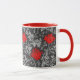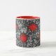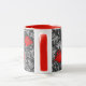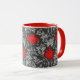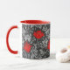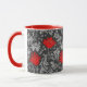 Caneca de café numa vintage William Morris cor damasco floral de flores e folhas de anêmona, melhorada digitalmente e colorida - cinza de prata clara / folhas de cinza, e flores em tons de batom profundo vermelho em um fundo de cinza de grafite escura