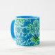 Mug de café em uma safra do padrão William Morris de hífenes, tulipas e folhas, em tons de azul-cobalto e ceruliano profundo, acentuados com marinho, amarelo e verde limão, sobre fundo azul-pastel do céu