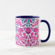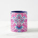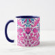 Mug de café numa vintagem William Morris, com ritmos de acintas, tulipas e folhas, em tons de fúsia e de cor-de-rosa macio, acentuados com azul escuro e turquesa, sobre fundo branco