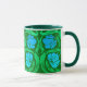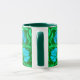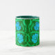 Mug em uma safra William Morris padrão têxtil estilizado de flores e folhas de pântano estilizadas - flores em um gradiente de azul-cerulano profundo a claro, com folhas verdes-esmeraldas leves, sobre um fundo verde-esmeralda profundo