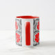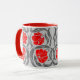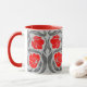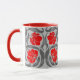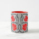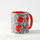 Mug em uma safra William Morris padrão têxtil estilizado de flores e folhas de pântano - flores em um gradiente de vermelho escuro a vermelho brilhante, com cinzas de grafite / folhas de cinza, sobre um fundo de cinza de prata clara