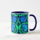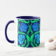 Mug em uma safra William Morris padrão têxtil estilizado de flores e folhas de pântano - flores em gradiente de azul-cerulano profundo a claro, com folhas de verde limão, sobre fundo azul-cobalto escuro