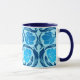 Mug em uma safra William Morris padrão têxtil estilizado de flores e folhas de pântano - flores em um gradiente de azul denim claro a escuro sobre fundo azul do céu pastel