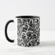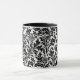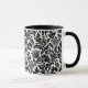 Caneca de café numa cor damasco antiga William Morris destas flores e folhas, a preto, sobre fundo branco, melhorada digitalmente e colorida