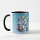 Charming winter illustration with a smiling snowman, striped scarf, blue mug of cocoa, boots and pine accents. Soft blue palette, warm accents, and cozy season feel!