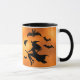 A bruxa e os morcegos se silenciam contra uma lua amarela e laranja.
