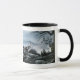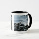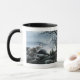 Dois Lobos sentados entre rochas fora de um castelo. Montanhas por toda a volta.