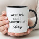 Fun modern typography reads World's Best Coworker with your colleagues name script font under it in a cool, trendy, minimalist black and white design. On the side is a cute emoji face icon.