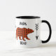 Se o seu Pai é um orgulhoso "Papa Urso", esta é uma caneca apropriada para qualquer ocasião, mas especialmente para o Dia de os pais ou o seu aniversário. Uma silhueta de xadrez de búfalo vermelha e preta anda entre duas setas pretas opostas. O texto preto por baixo e por cima da imagem do urso diz "Papa Urso". A imagem e o texto são repetidos em dois lados da caneca.