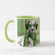 Um cão Dalmaciano muito na moda em óculos de sol verdes e um cachecol verde de inverno contra um fundo com padrões de xadrez em tons de verde. Excelente para os feriados, mas ok a qualquer momento do ano.